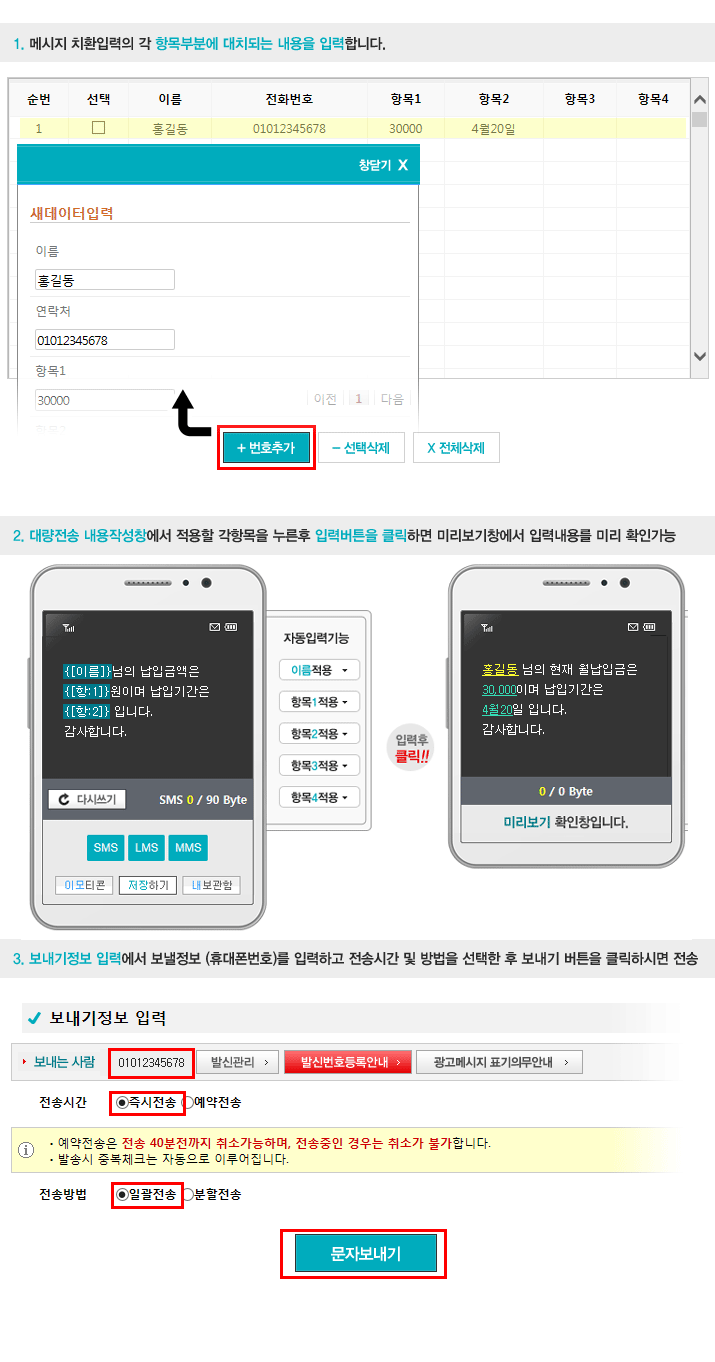 자동입력기능을 사용하여 각각 다른 사람에게 다른 내용의 메세지를 보내실 수 있습니다.